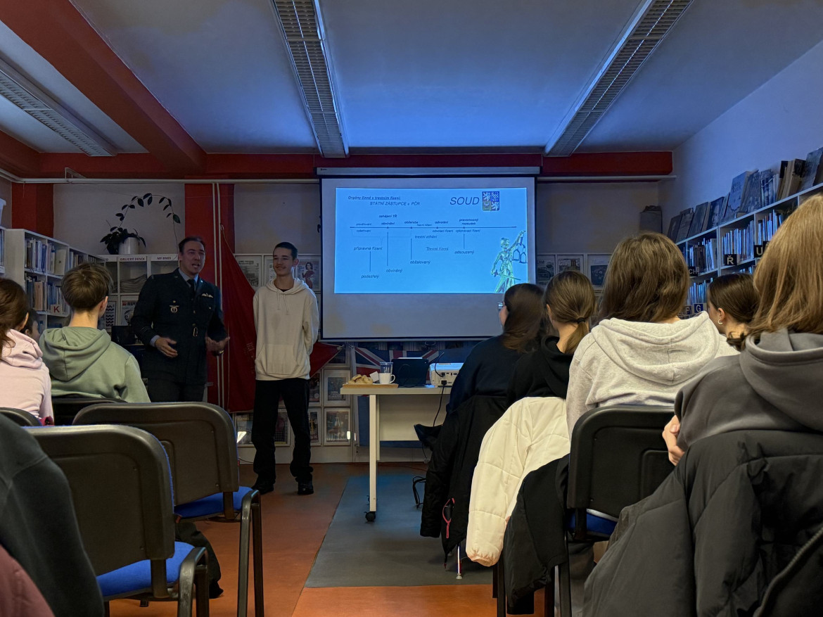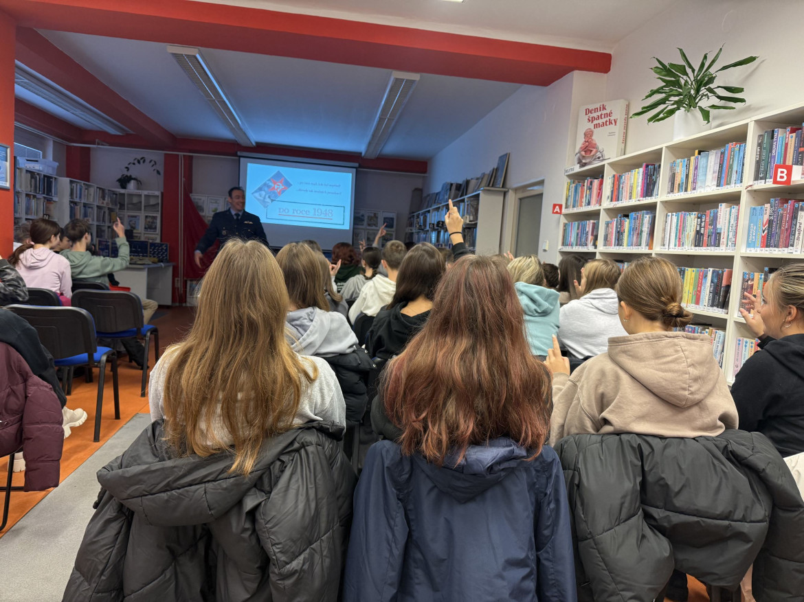 Deváťáci si ve středu 26. listopadu v městské knihovně užili dvě dopolední hodiny plné historie a občanské výchovy. Nejprve společně s přednášejícím – panem Švecem dali dohromady současné právní předpisy. Potom jim pan Švec vysvětlil, co všechno se změnilo v právním systému po roce 1948 a ano, zjistili jsme, že tehdejší zákony dokázaly být přísnější, než jsme si zatím představovali. Žáci statečně sledovali osudy našich bývalých letců RAF, jejich utrpení a boj o život svůj a své rodiny. Místo poklidného života a uznání je totiž čekaly útrapy komunistického režimu, se kterým souvisely všechny právní otočky. Žáci byli během besedy velmi aktivní, což těšilo nejen přednášejícího, ale i jejich vyučující.