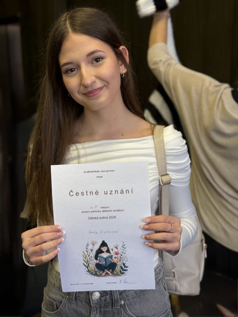 A právě Tereza Vrabcová ukázala, jak se to dělá. S textem „Jak vypadají hvězdy“ od Františka Nepila doslova zazářila a vybojovala čestné uznání. Postup to sice není, ale v konkurenci gymnazistů a žáků ZUŠ jde o velmi mimořádný výkon.