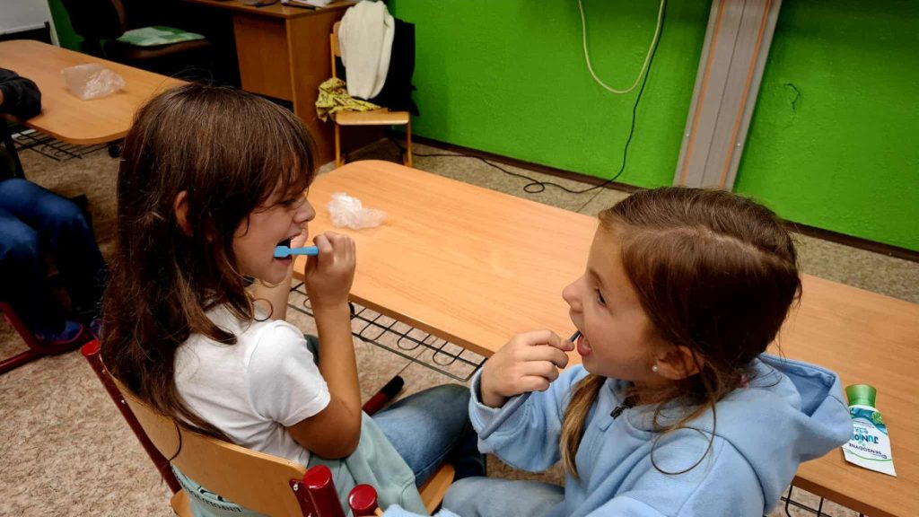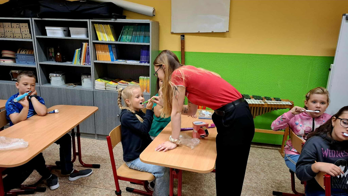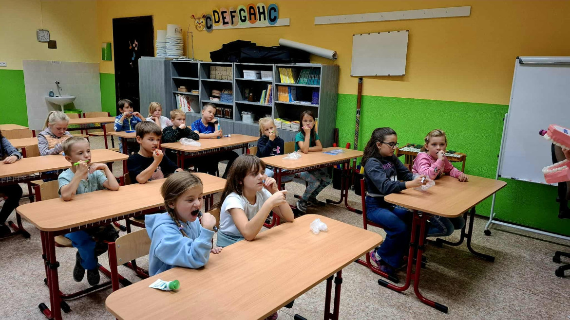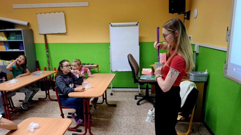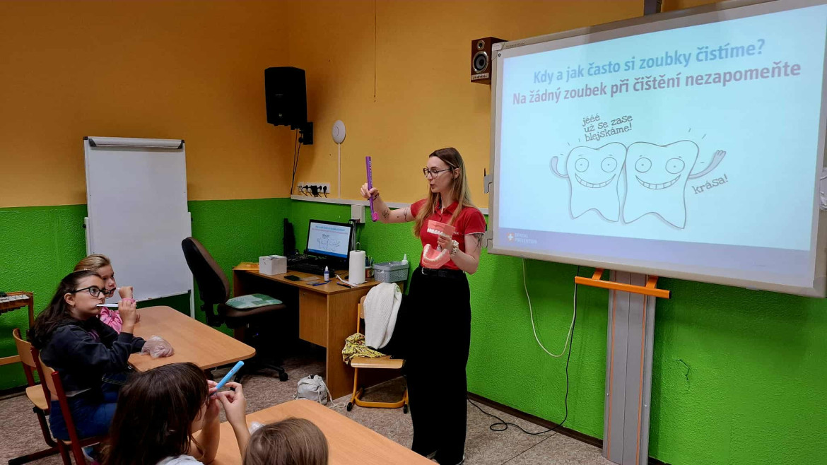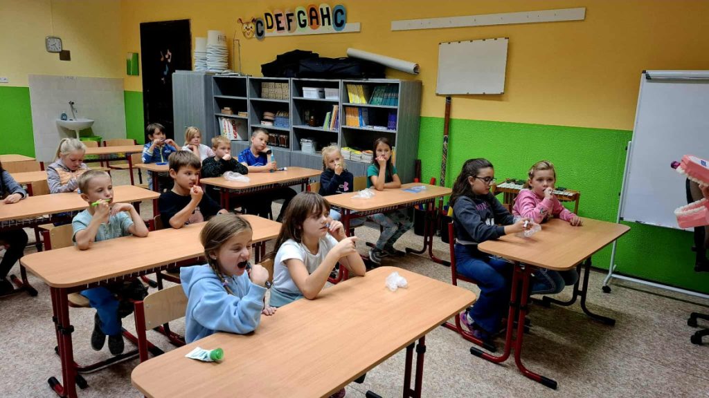 Ve čtvrtek 25.9. nás navštívila budoucí paní zubařka, která si pro děti připravila poutavý program zaměřený na správnou péči o chrup. Děti si do školy přinesly své vlastní kartáčky a nejprve si vyslechly krátkou prezentaci o tom, proč jsou zuby důležité a jak o ně správně pečovat. Poté si společně zoubky vyčistily a slečna jim ukázala správný postup čištění.