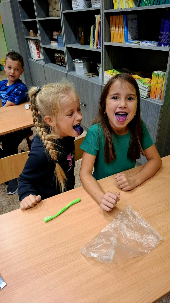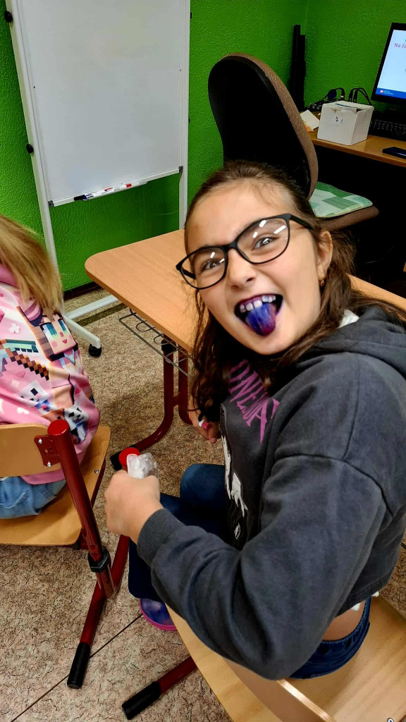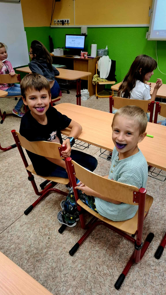 Na závěr čekalo děti malé překvapení! Pomocí speciální „chytré“ fialové vodičky si vyzkoušely, zda si zoubky vyčistily opravdu důkladně. Byla to nejen zábava, ale hlavně cenná zkušenost, která dětem ukázala, jak důležité je čistit si zuby každý den.