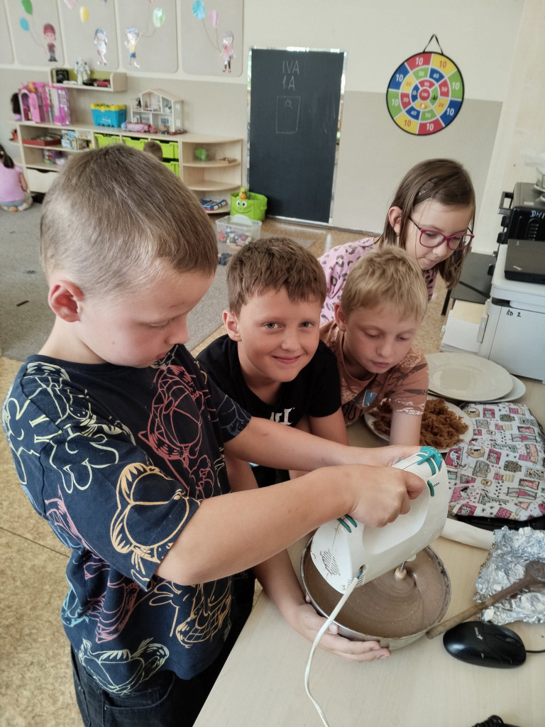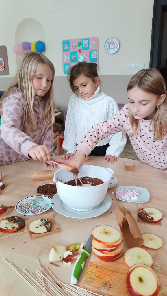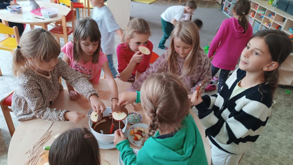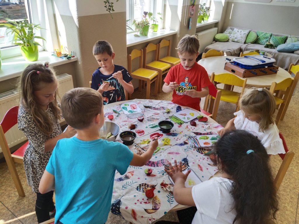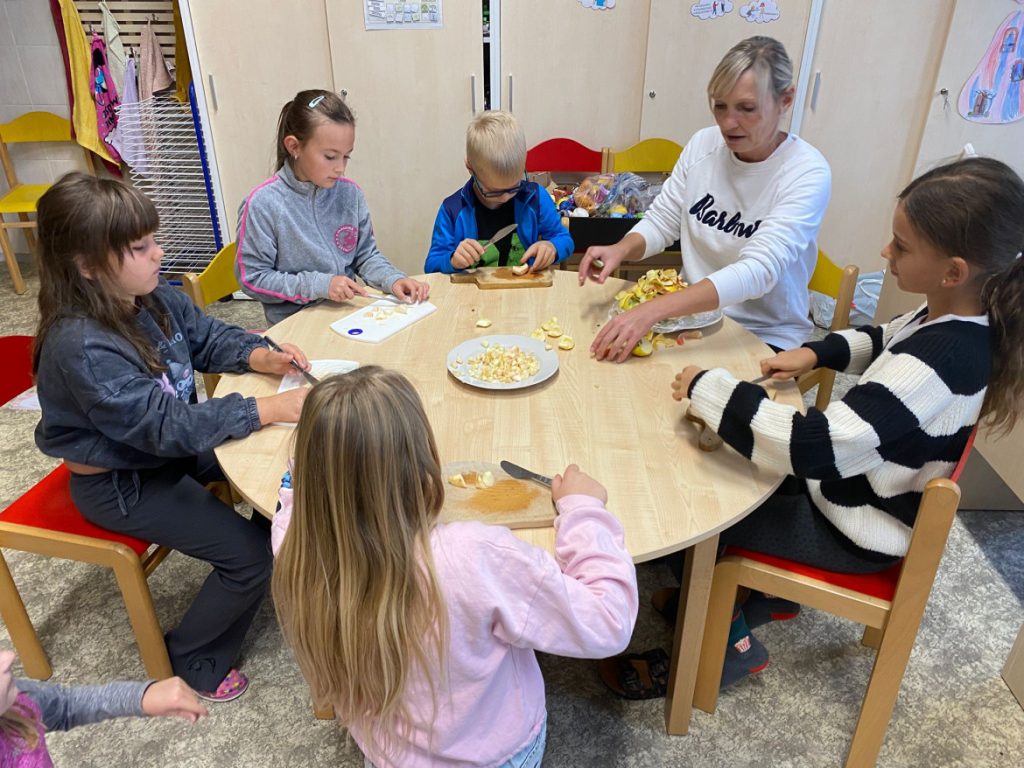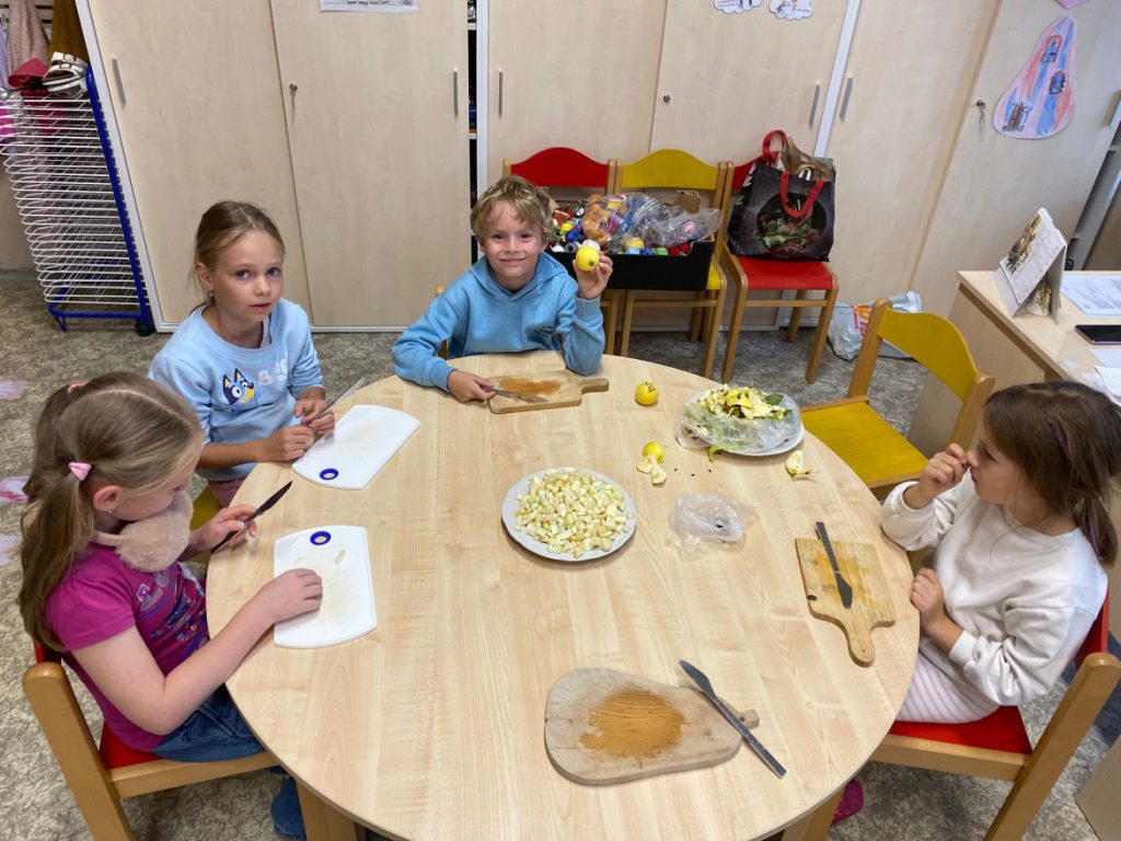 Během měsíce září jsme postupně zpracovali poklady, které se urodily na našich zahradách. Upekli jsme si hruškové muffiny 🧁, perník s hruškami 🍐, uvařili jablečný 🍎kompot a vyrobili jablečná lízátka 🍭. Nejmenší ovoce jsme využili na razítka a každý si „zavařil“ vlastní kompot. Nakonec jsme ubytovali všechna zvířátka ze sadu do hruškových obydlí. ❤️
