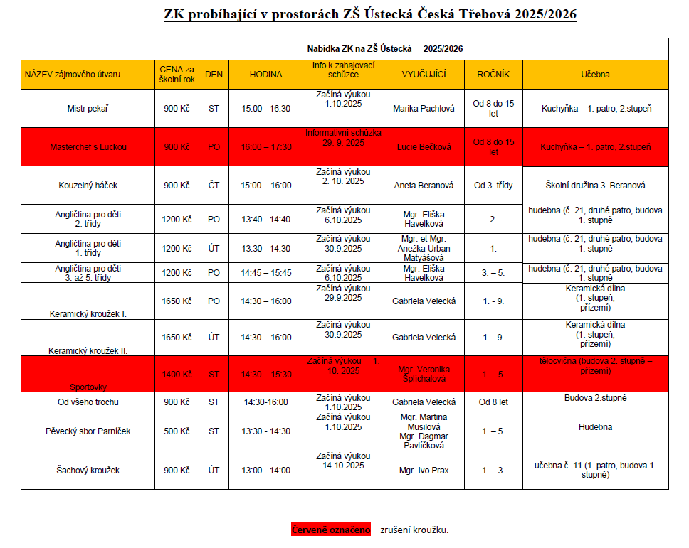 V uvedených časech po celou dobu bude probíhat výuka. Děti si s sebou vezmou blok, psací potřeby, přezůvky. Další informace se děti dozví při první schůzce. Vyučující pedagog zodpovídá za děti po dobu trvání zájmového kroužku, jak je uvedeno výše v tabulce.