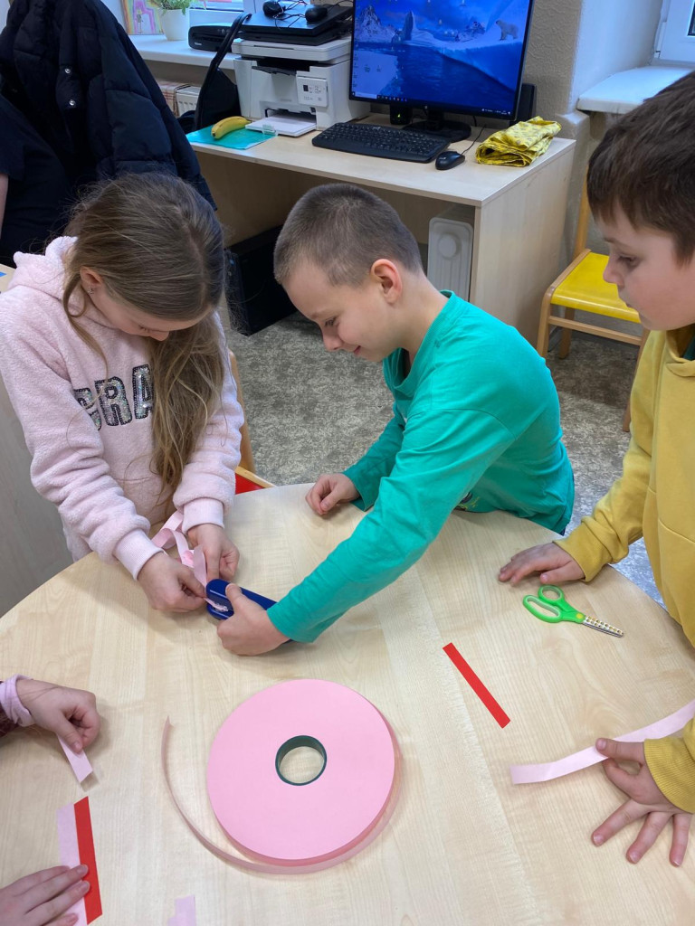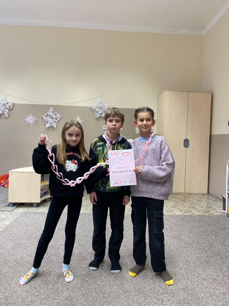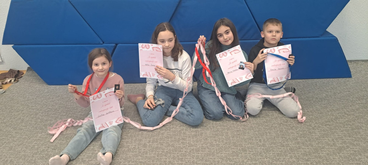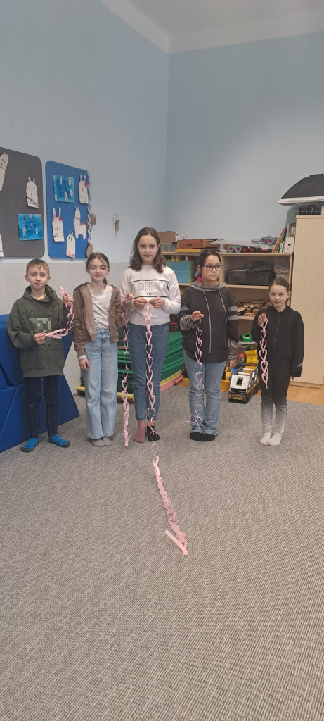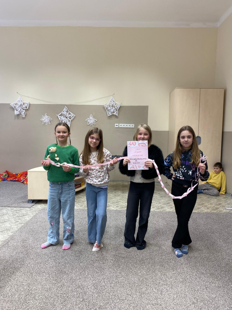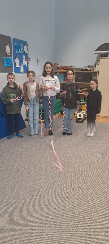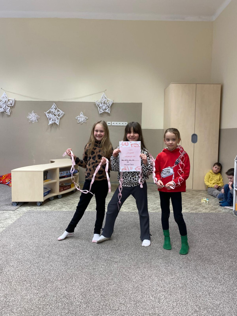 Ještě než se nám děti rozprchly za zážitky jarních prázdnin, stihli jsme pro ně uspořádat turnaj. Hlavním úkolem bylo vytvořit co nejdelší srdíčkový řetěz. Děti soutěžily ve skupinkách a hned od začátku bylo jasné, že nepůjde jen o soutěžení, ale hlavně o spolupráci, trpělivost a společnou radost z tvoření . Některé děti vsadily na rychlost, jiné na pečlivost. Postupně se na zemi prodlužovaly řetězy z růžových srdíček. Vítězné týmy se mohly pochlubit opravdu úctyhodnou délkou svých řetězů, ale pochvalu si zasloužili úplně všichni účastníci . Hotové řetězy jsme poté využili také jako valentýnskou výzdobu školy.
